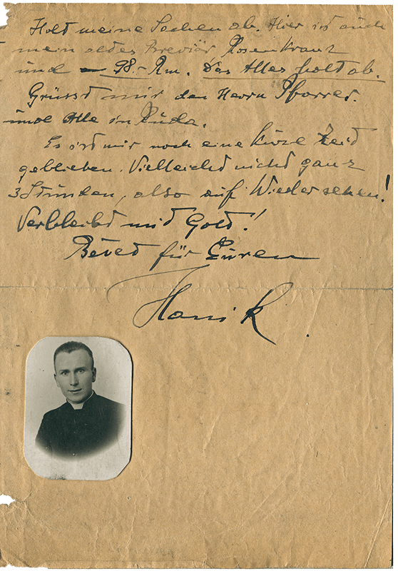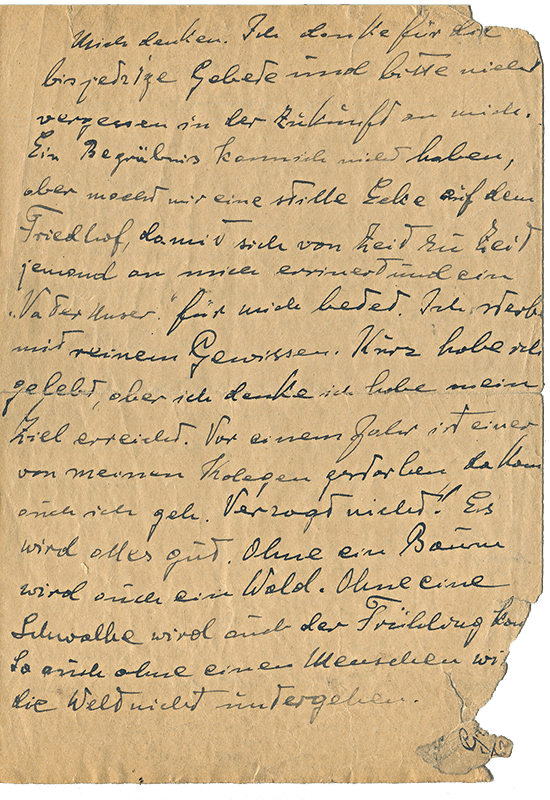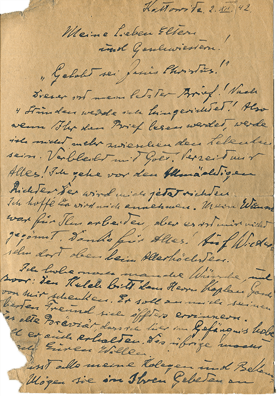 Jeszcze na trzy godziny przed śmiercią zapewniał, że ma wiarę w miłosierdzie Boże: „Idę przed Wszechmogącego Sędziego, który mnie teraz osądzi. Mam nadzieję, że mnie przyjmie. Moim życzeniem było pracować dla Niego, ale nie było mi to dane” (2 XII 1942) i wyrażał wiarę, że spotka się w niebie z najbliższymi: „Do widzenia tam w górze u Wszechmogącego” (2 XII 1942).